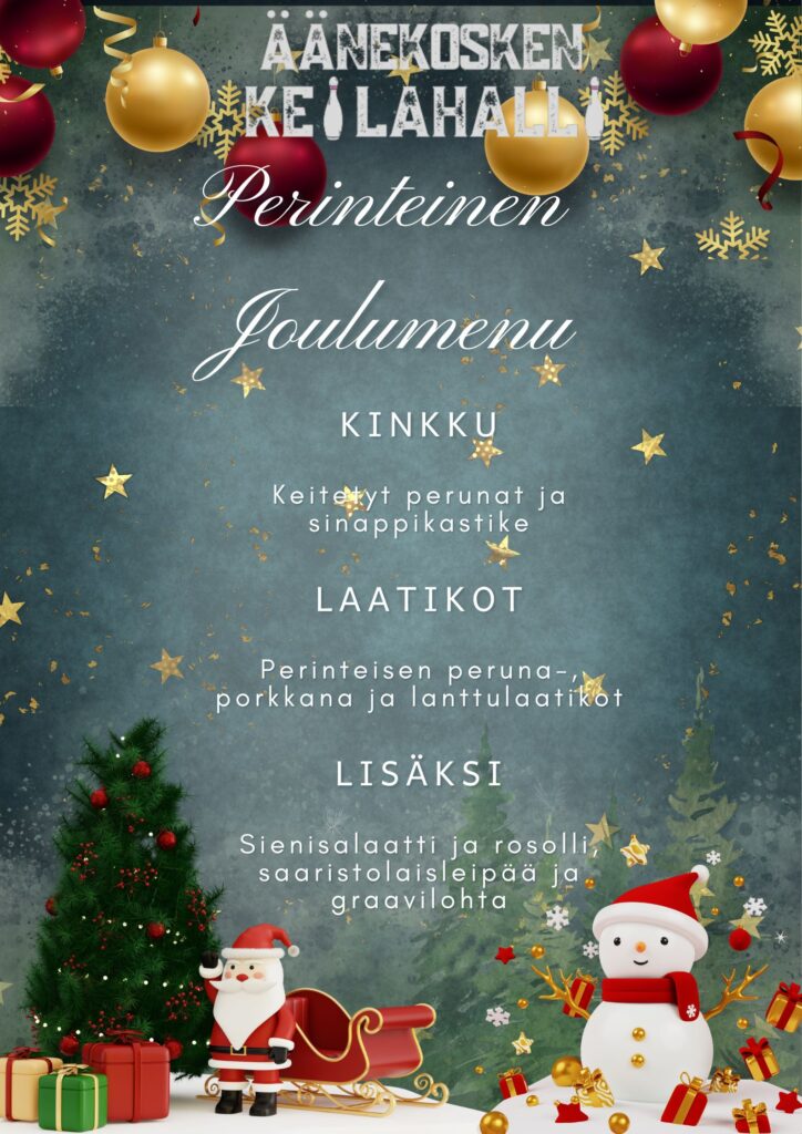 Kysy tarjousta ryhmälle tai paiskaa vaikka palautteella osoitteeseen keilahalli@aanekoskenkeilahalli.fi. Voit lukea lisää myös palvelumme -välilehdeltä. JOULUMENU ON NYT MYYNNISSÄ: